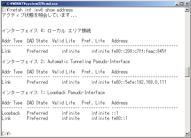 インターフェース番号を確認する方法はipconfigコマンド以外にも、ipv6 ifコマンドを使う方法とnetsh interface ipv6 show addressコマンドとある。2003サーバーにはIPv6コマンドが無いのでnetshを利用する。このときにループバックアドレスも確認できる。
